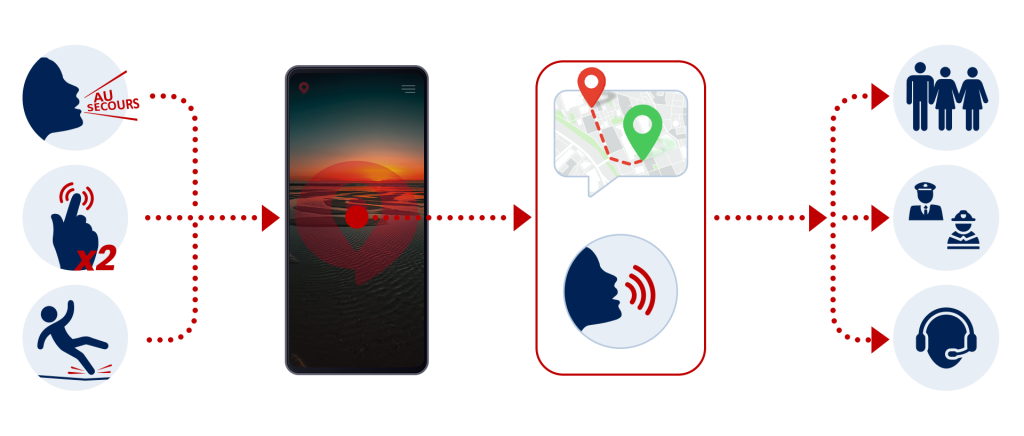 Lorsqu’une alerte est déclenchée (chute détectée, bouton pressé, commande vocale) :